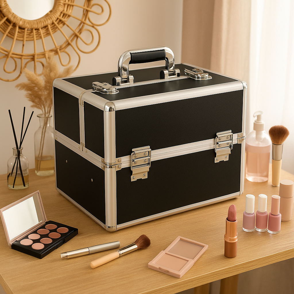 Zadbaj o porządek w swoich kosmetykach z eleganckim i funkcjonalnym kuferkiem kosmetycznym w kolorze czarnym. Model z dwupoziomową konstrukcją – idealny zarówno dla mobilnej makijażystki/kosmetyczki, jak i do użytku domowego lub w podróży.