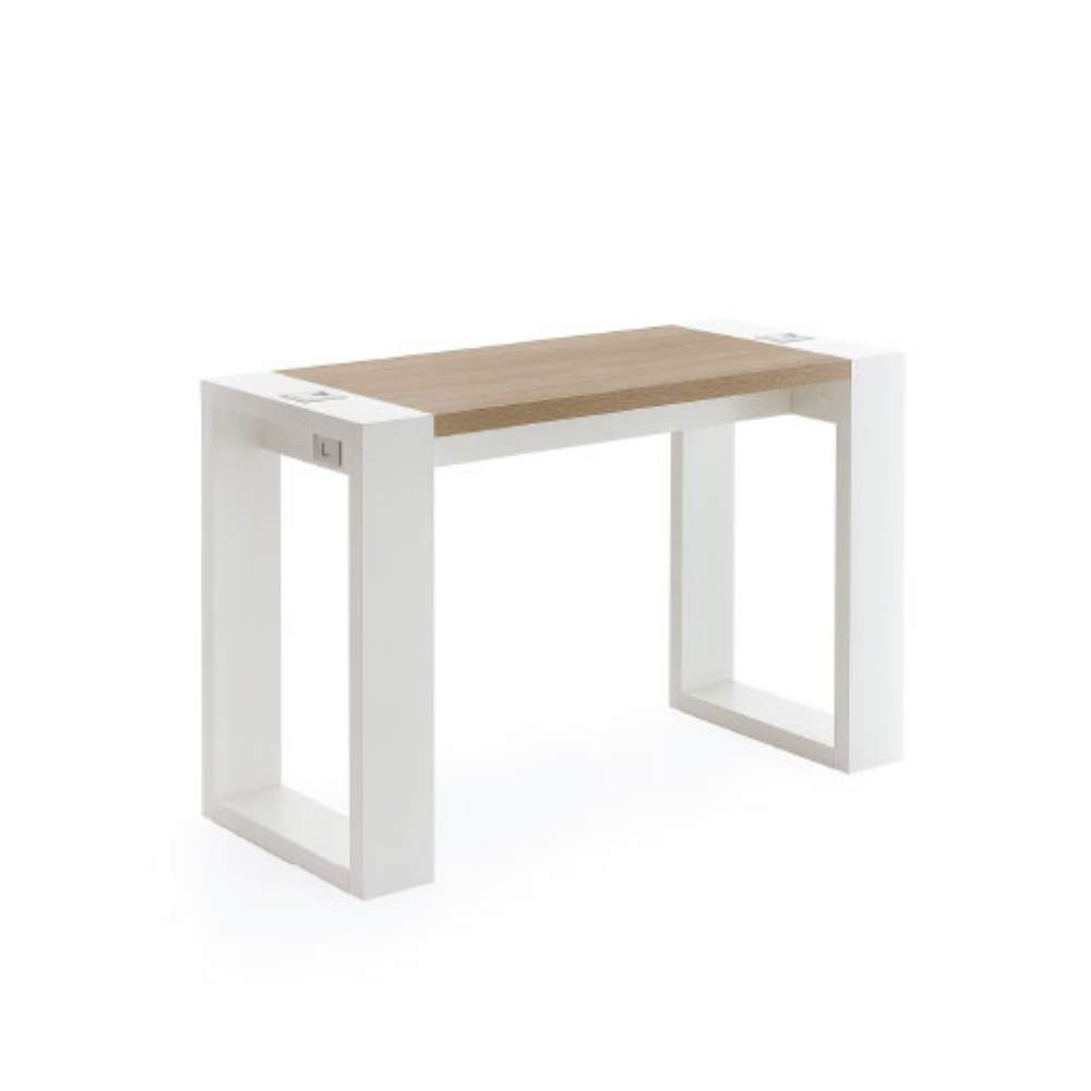 Biurko ma kompaktowe wymiary, zostało wykonane z białej, matowej płyty laminowanej.