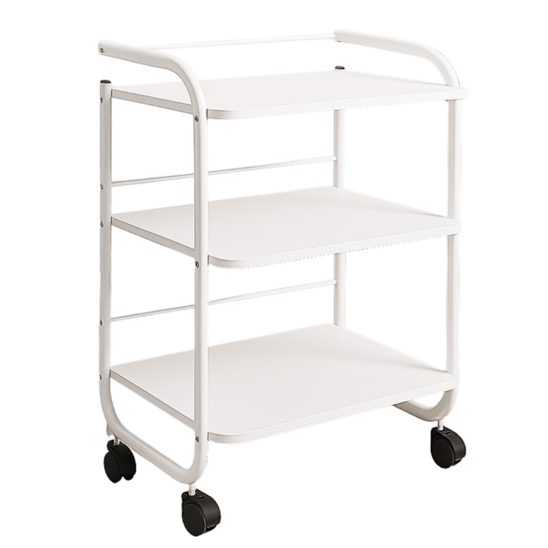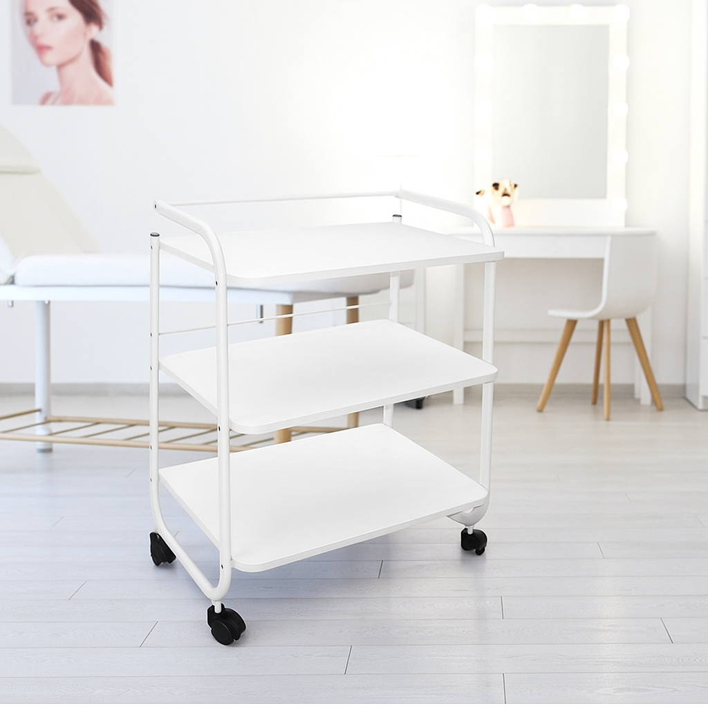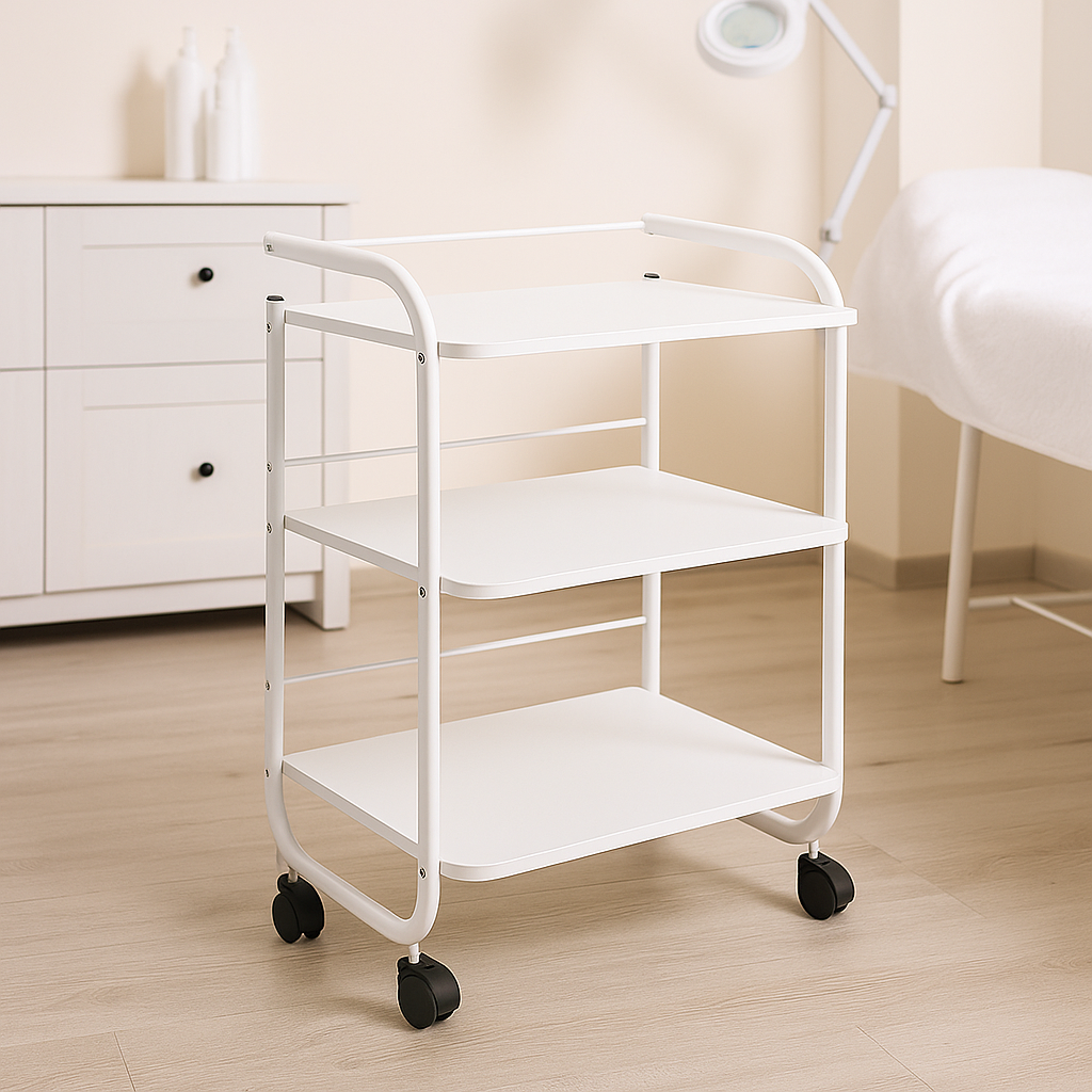 Dzięki trzem funkcjonalnym półkom i ergonomicznemu uchwytowi, stolik ułatwia organizację przestrzeni pracy, zwiększając efektywność zabiegów. Jego elegancki wygląd podnosi standard estetyczny gabinetu, co wpływa pozytywnie na doświadczenie klienta.