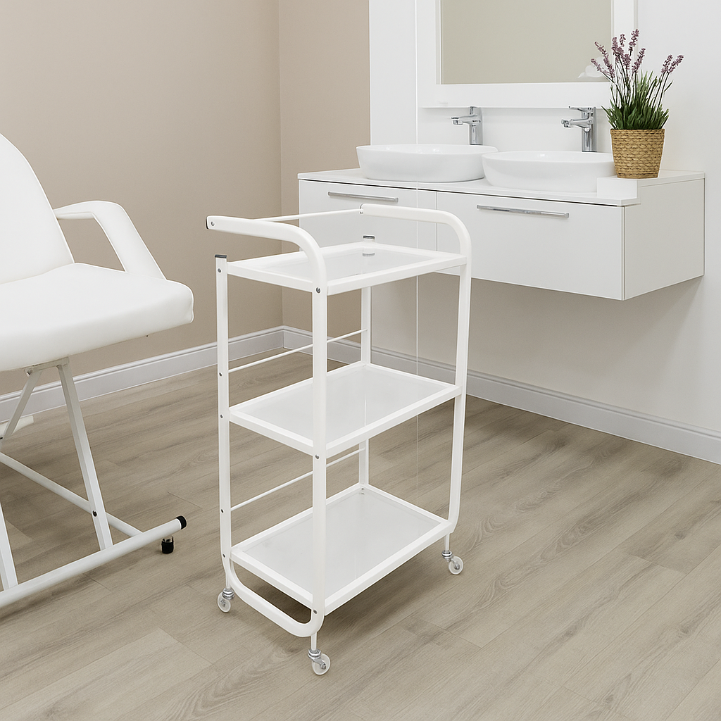 Stolik kosmetyczny G Plus z 3 półkami i praktycznym uchwytem to idealne rozwiązanie dla profesjonalistów branży beauty. Zaprojektowany z myślą o funkcjonalności i nowoczesnym designie, doskonale sprawdzi się w salonach kosmetycznych, gabinetach medycyny estetycznej, SPA, salonach fryzjerskich oraz salonach manicure.