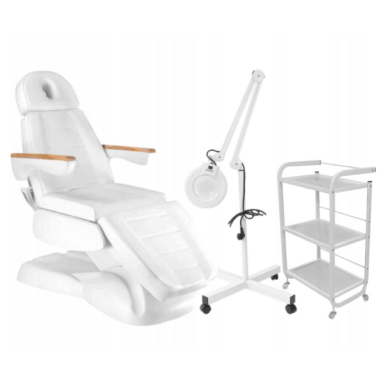 Zestaw do wyposażenia salonu kosmetycznego, SPA: fotel kosmetyczny elektryczny + lampa lupa + stolik kosmetyczny – wyposaż swój salon jednym kliknięciem!