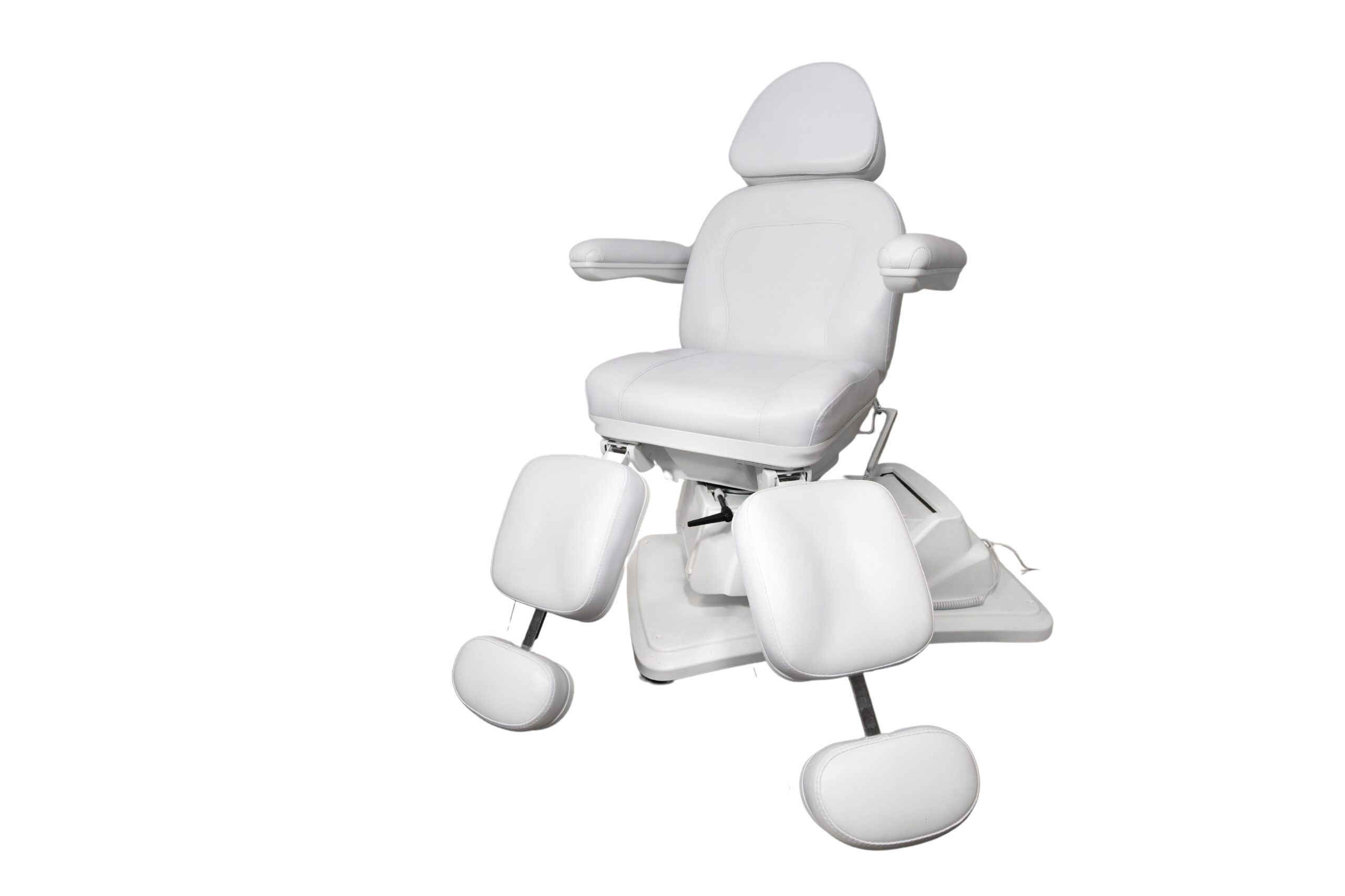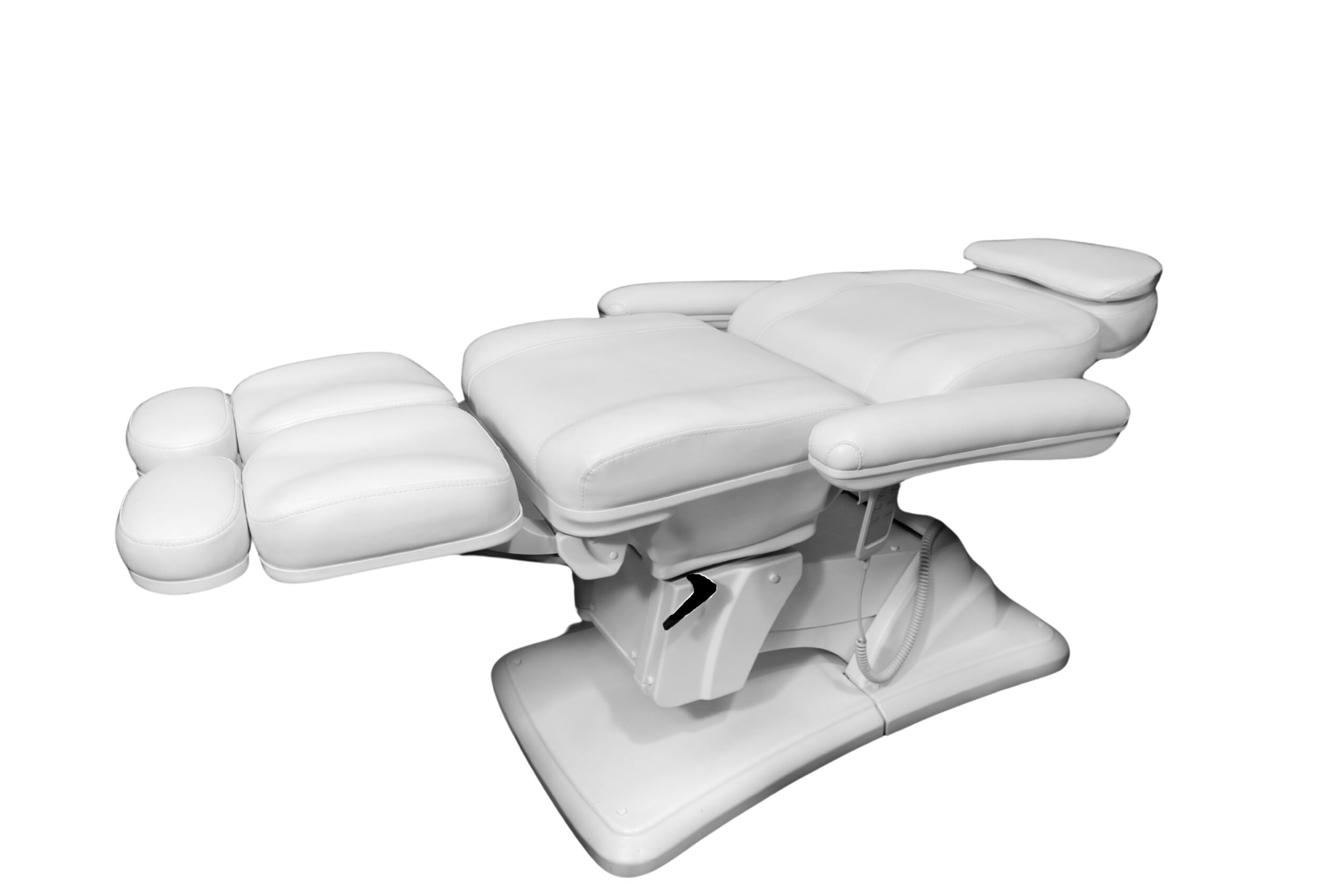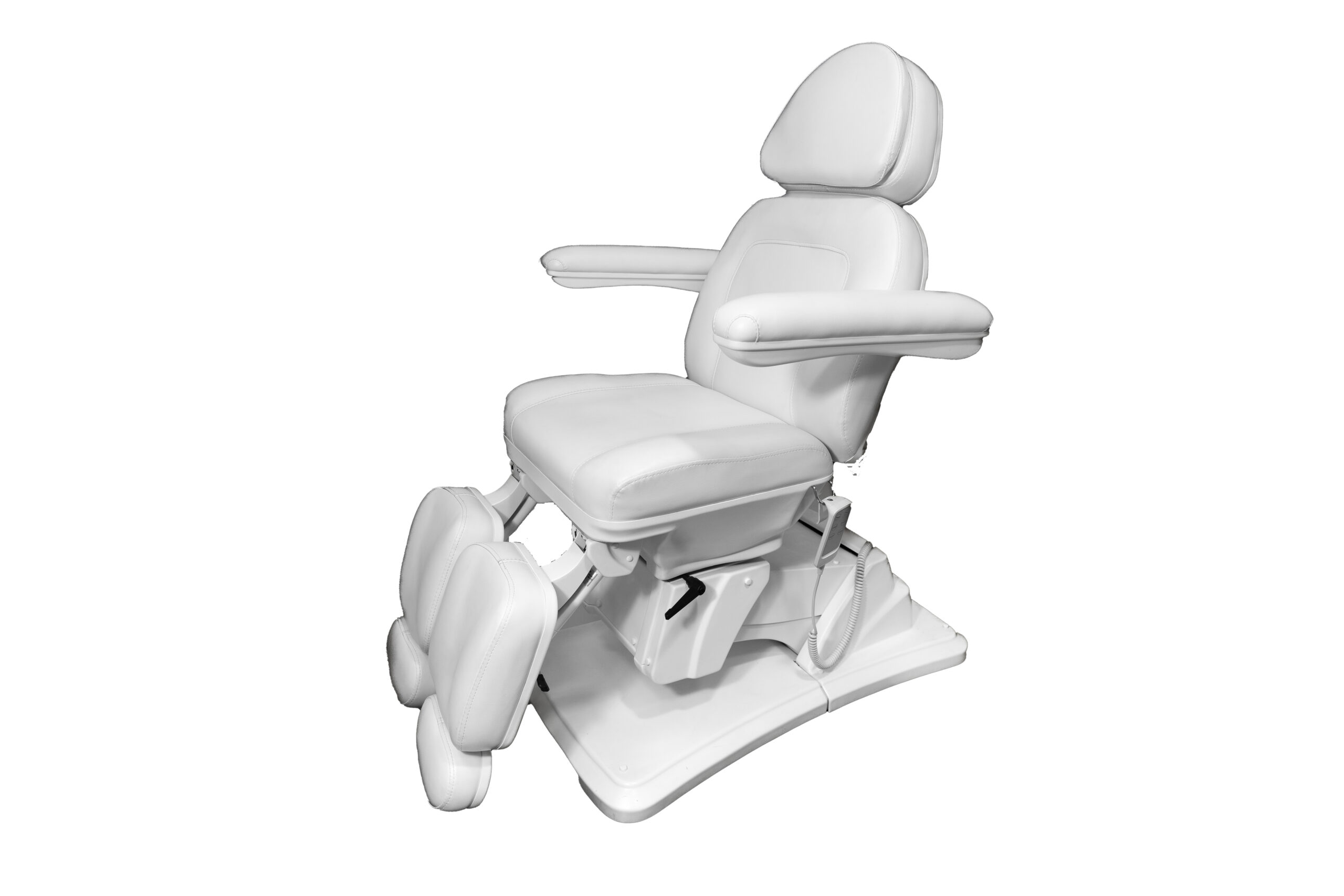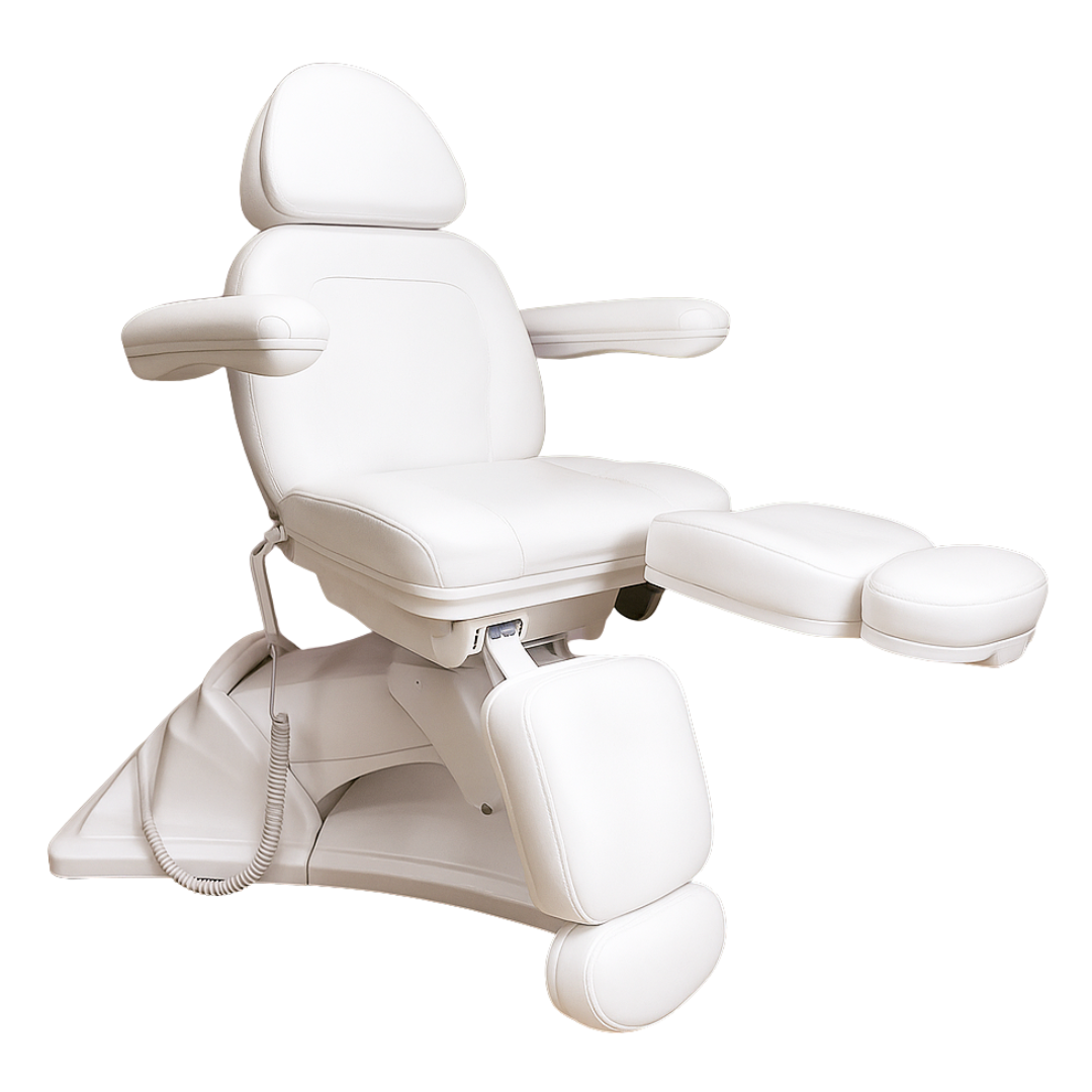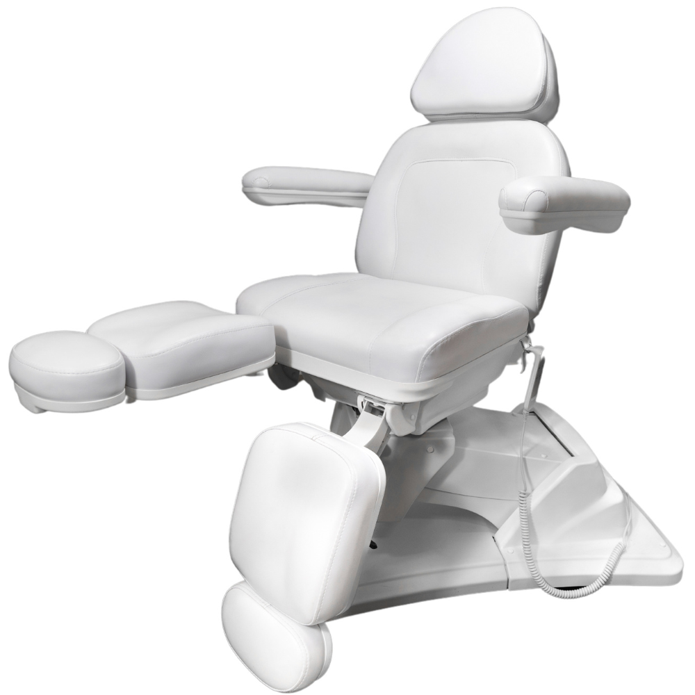To, co go wyróżnia, to funkcjonalność elektryczna zapewniająca sterowanie bez wysiłku za pomocą intuicyjnego pilota połączonego kablem. Za jego pomocą wyregulujesz wysokość fotela i kąt oparcia. Trzeci silnik odpowiada za funkcję kołyski, co wraz z ręcznie regulowanymi podnóżkami pozwala dobrać idealną pozycję uwzględniając różne zabiegi i zapewniając optymalną wygodę dla klienta.