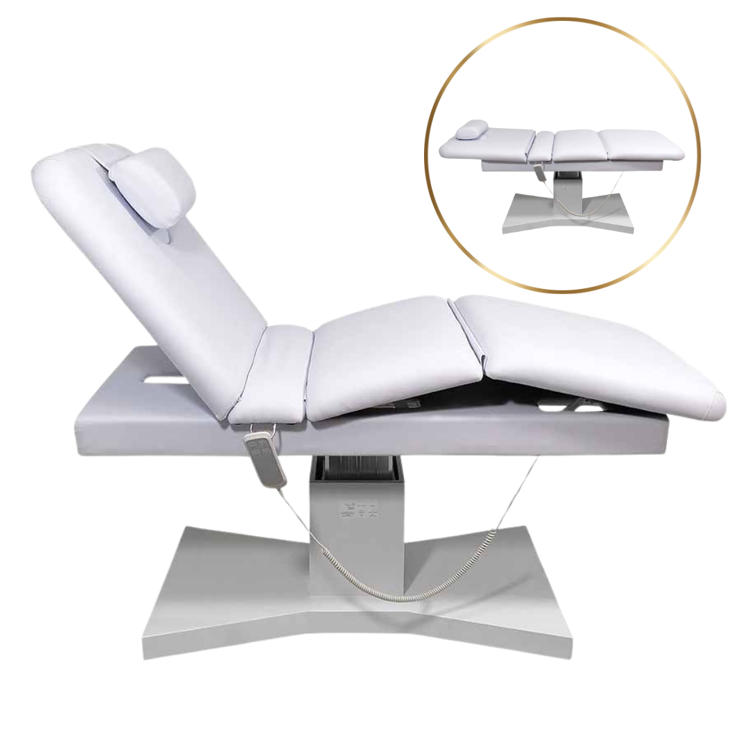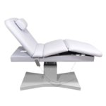 Ekskluzywna leżanka kosmetyczna w kolorze białym. Jest jednym z elementów podstawowego wyposażenia salonów kosmetycznych, Spa, medycyny estetycznej oraz gabinetów masażu.