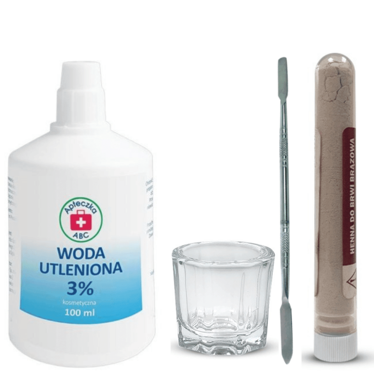 W zestawie: henna proszkowa KAMA brązowa, woda utleniona 3%, kieliszek do henny, bagietka do henny.
