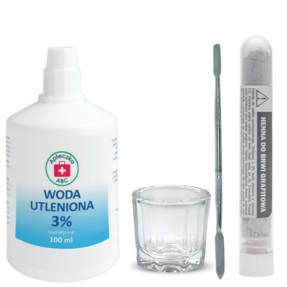 W zestawie: henna proszkowa KAMA grafit, woda utleniona 3%, kieliszek do henny, bagietka do henny.