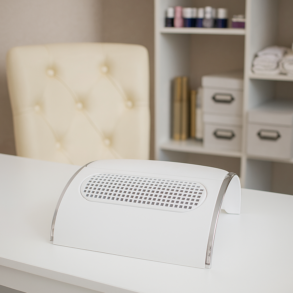 Funkcja pochłaniacza pyłu i podstawki pod dłoń w jednym urządzeniu – co pozwala na ergonomiczne i komfortowe ułożenie dłoni klientki.